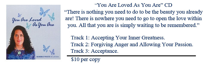 Barbra, a revolutionary spiritual teacher, shares her intuitive gifts, self-acceptance tools, natural healing approach and compassionate guidance in a variety of ways, from personal, one-on-one mentoring to her weekly radio show. Barbra is also a published author and guided meditation teacher whose approach has changed the lives of so many she has been called, "the midwife to your soul". This shopping page allows meditators and spiritual seekers from all over the world to experience Barbra's unique and powerful healing approach. |